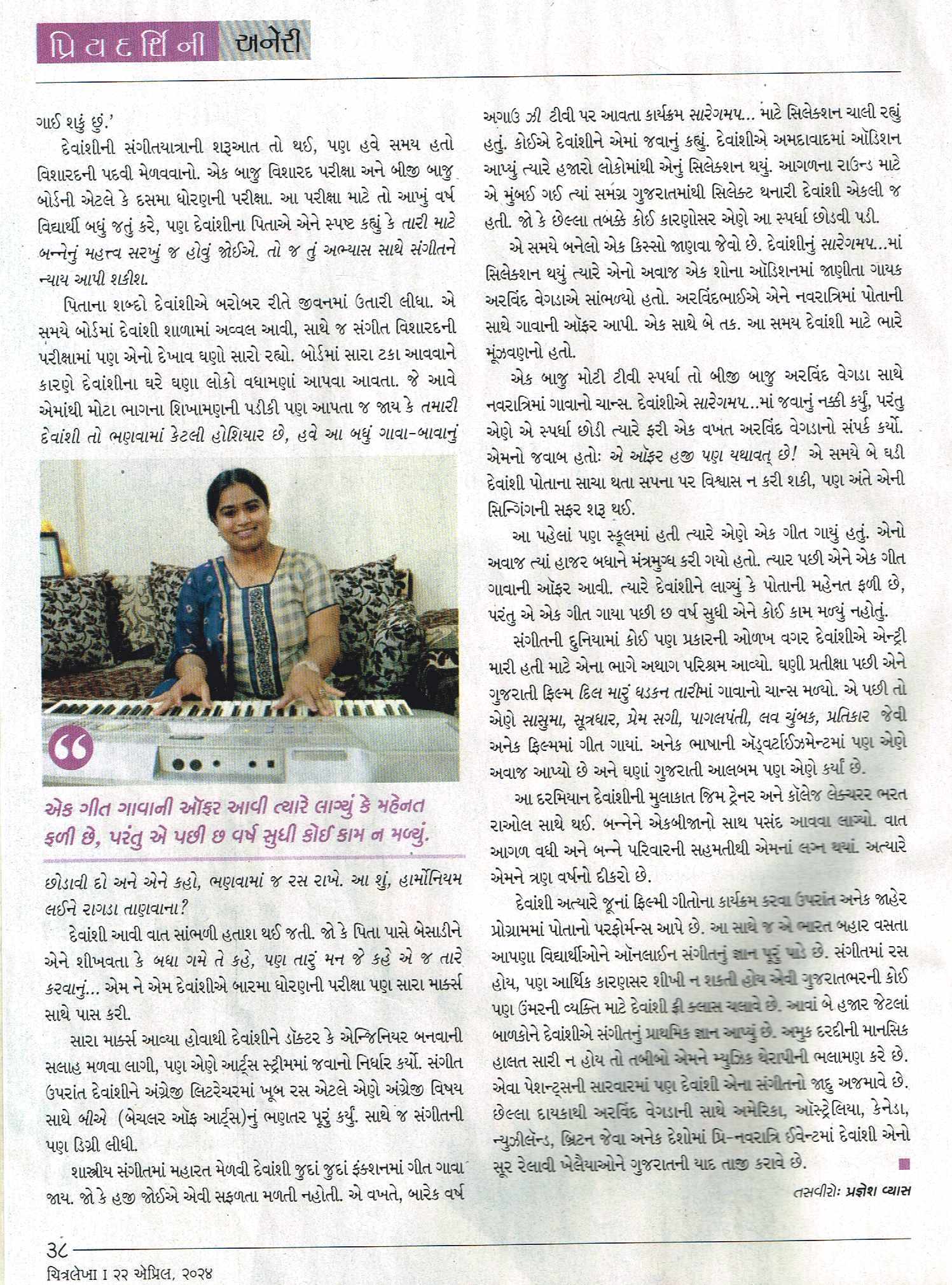 Devanshi Shah is a versatile playback singer, music teacher and live performer, captivating audiences in India and abroad. She has graduated in classical vocal and harmonium, achieving her Sangeet Visharad at the young age of 16. Devanshi has also honed her skills with specialized training in voice culture. Her extensive experience and passion for music shine through in every performance, making her a sought-after artist in the industry. Whether teaching or performing live, Devanshi's dedication to her craft is evident in her exceptional musical talent